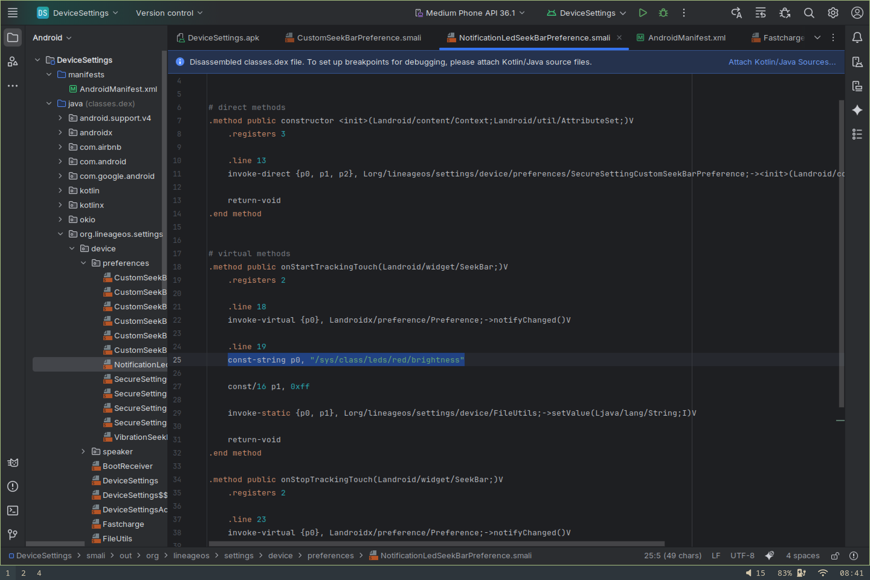 Funnily enough I already had everything that I needed, Android Studio. Googling led me to find out that the package was called org.Lineageos.settings.device. What does LineageOS have to do about this? I don’t know, I was too excited to finally figure out what triggered it. After pulling the APK and opening it in Android studio I found the file responsible for it scouring through the directory tree.